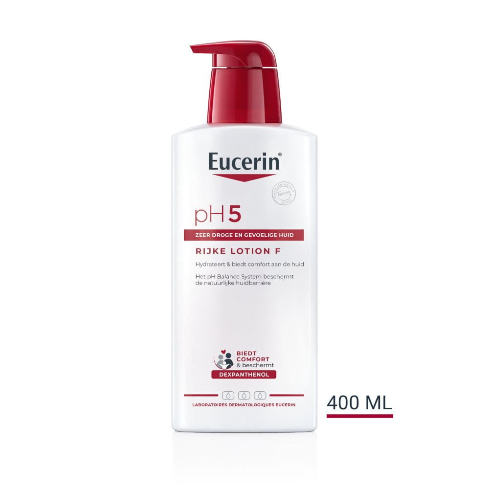 De gevoelige huid heeft speciale verzorging nodig om weerstand te bieden aan schadelijke invloeden van buitenaf. Geef comfort aan uw huid en bescherm deze met Eucerin pH5 Rijke Lotion F. Geef uw huid een nieuw gevoel van welzijn. De formule, verrijkt met 5% Dexpanthenol, verzacht en hydrateert de huid en biedt onmiddellijk comfort. De huid is gehydrateerd en de pH-waarde wordt gerespecteerd. Zelfs de meest gevoelige huid wordt versterkt, beschermd en voelt weer comfortabel aan. Gebruik de Eucerin pH5 Rijke Lotion F dagelijks voor een zachte en soepele huid. Deze Lotion is geschikt voor dagelijks gebruik, zelfs voor de allergiegevoelige huid - type 1 allergie (b.v. hooikoorts) en bij kinderen vanaf 3 jaar.